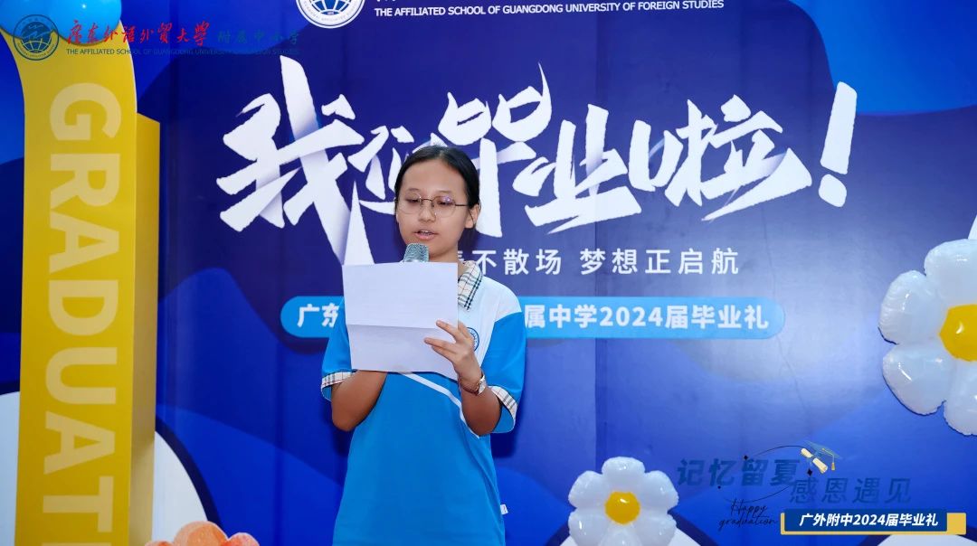 一生广外人,一世广外情。学校党支部书记兼校长方建军向圆满完成初中学业任务的莘莘学子表示最热烈的祝贺,向三年来为同学们兢兢业业、夙兴夜寐的各位老师和家长表示衷心的感谢。会上方校介绍了优秀毕业生代表的成长历程,希望同学们向榜样学习,汲取榜样力量,在未来的生涯中保持冲劲、韧劲、干劲,拥有“千磨万击还坚劲,越是艰险越向前”的决心。