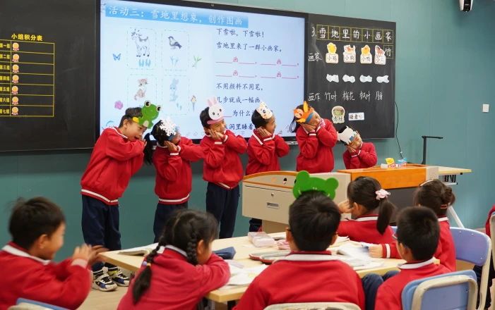 陈雅男老师执教一年级语文课《雪地里的小画家》。本课是小学语文部编版一年级上册第五单元第三篇课文,是一首富有儿童情趣、蕴含科普知识的儿歌,描绘了一群“小画家”在雪地里作画的场景,语言浅显易懂,读起来朗朗上口,生动有趣。陈老师的课堂营造了浓浓的冬日雪景氛围,让孩子们大胆想象在雪地里狂欢,增加了学习的趣味性;在雪地里歌唱,让学生通过音乐感受冬天的魅力和动物的可爱;在雪地里绘画,让学生将文字转化为图像,锻炼了他们的想象力和创造力,加深了对课文内容的理解和记忆;探索小青蛙冬眠的奥秘,提升科学思维。整堂课巧妙地将语文与绘画、音乐、科学知识等融合,激发学生的学习兴趣,培养学生的观察力、想象力、语言表达能力和创造力。