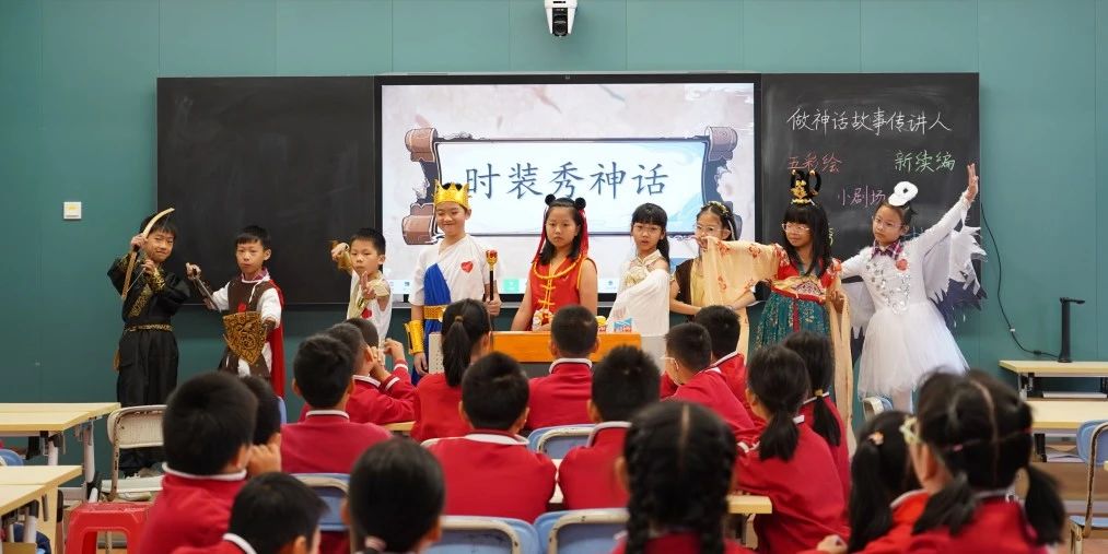 赵杰老师执教四年级语文课《做神话故事传讲人》。传统神话故事作为文化遗产,一直以来都扮演着教育与研究的重要角色。在现代的跨学科教学中,也越来越多地运用到了神话故事的元素,通过身临其境的方式,让学生更好地理解和应用知识。这节课由语文赵杰老师带领同学们探寻神话故事的奥秘,同学们分成五个小组,分别用五彩绘、新续编、小剧场、时装秀、科技炫的形式来展现神话故事的风采。在老师的组织和指导下,各小组依次进行汇报展示,同学们讲解生动,充满了热情和自信,课堂上精彩纷呈,大家用自己的方式诠释了对神话故事的理解和感悟。赵杰老师将语文、历史、哲学、艺术、信息技术等多学科知识融为一体,引导学生深入了解中华优秀传统文化,培养学生的文化自信。
