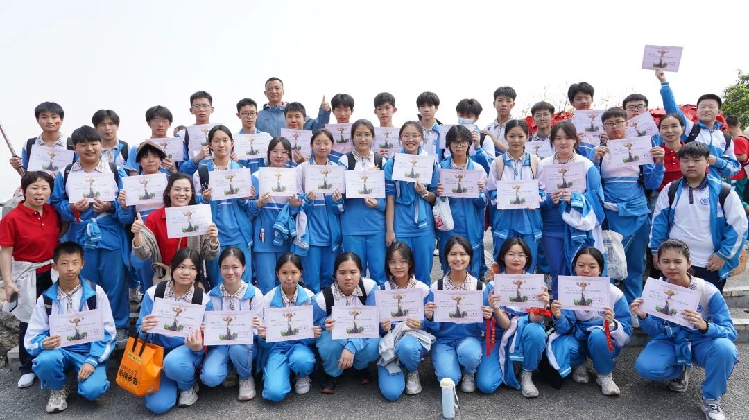 历时两个小时,师生们雄赳赳气昂昂在山间小路上前行,整齐行进间,我们看到了师生的坚定的信念;快速有序间,我们看到了师生对“必胜”的渴望。师生士气满满,登顶白云山,将写满目标的许愿带和许愿牌系于摩星岭。山风拂过,红绸如火焰跃动,许愿牌翻飞作响,见证少年对未来的庄严期许。同学们整齐排队,手持登顶奖状,再次喊出心中的誓言,铿锵坚定的声音响彻摩星岭山顶!山河见证少年的誓言,期待百日后学子能圆梦七月!