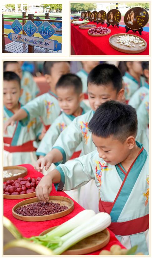 仪式伊始,一年级新生在老师的带领下,依次完成 “摸五谷” 与 “过状元桥” 的传统环节。孩子们伸手触摸象征美好寓意的五谷——摸大葱盼“聪明伶俐”,摸芹菜寄“勤奋好学”,摸生菜愿“步步高升”,摸莲子祝“和和美美”,摸黄豆望“飞黄腾达”,每一份触摸都承载着学校与家长对孩子的殷切期许。