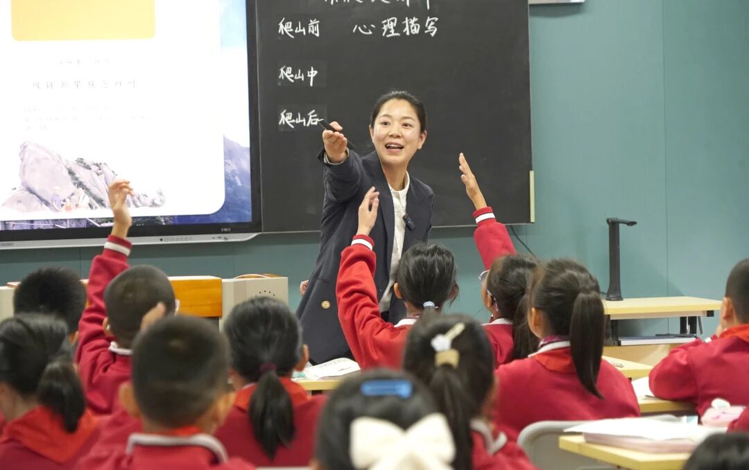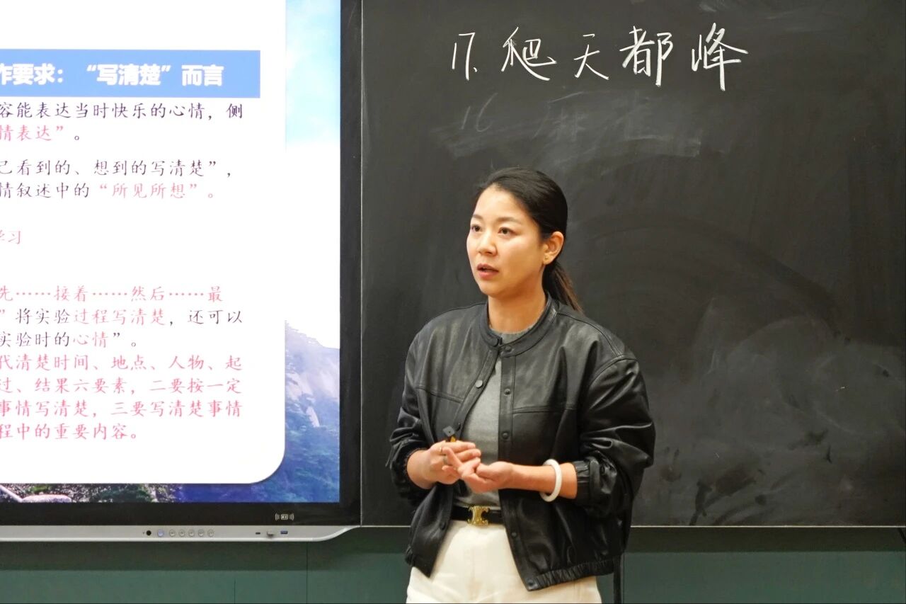 王鑫鑫老师的《爬天都峰》课堂,则以“生活万花筒·记事小达人”挑战赛为核心,带领学生开启三轮师生挑战赛,聚焦“写清楚”:第一关聚焦爬山前的心理描写,给学生以挑战的信心,营造良好的课堂氛围;第二关挑战老师将文中“对话”部分删除的片段,辨析原文与简化版的表达效果,掌握“用对话将事情写清楚”的写作秘籍。第三关,围绕“结尾是否多余”展开思辨。最后将两篇精读课文进行对比,呈现了习作单元的梯度。在《爬天都峰》的课堂上,教师从“平等蹲下来”的视角里,让学生的思考被看见。