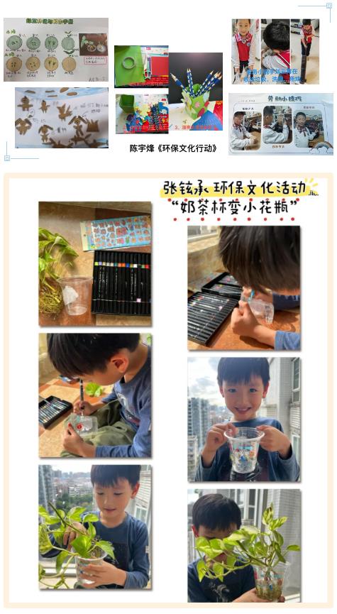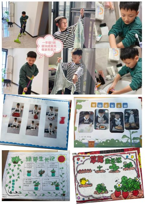 一年级至二年级的萌娃们,在劳动中解锁成长新技能。书包整理如魔法般规整,衣物折叠尽显条理,桌面收纳与餐具摆放暗藏巧思,步骤影像定格专注瞬间;亲手栽种的小盆栽绿意盎然,图文并茂的成长卡记录着生命拔节的惊喜,校园植物认养之旅满是探索乐趣;废旧物在指尖焕发新生,垃圾分类打卡践行环保理念,传统自理技能传承着生活智慧,一本本色彩斑斓的 “劳动成长手册”,绘就出童真满满的劳动图景。