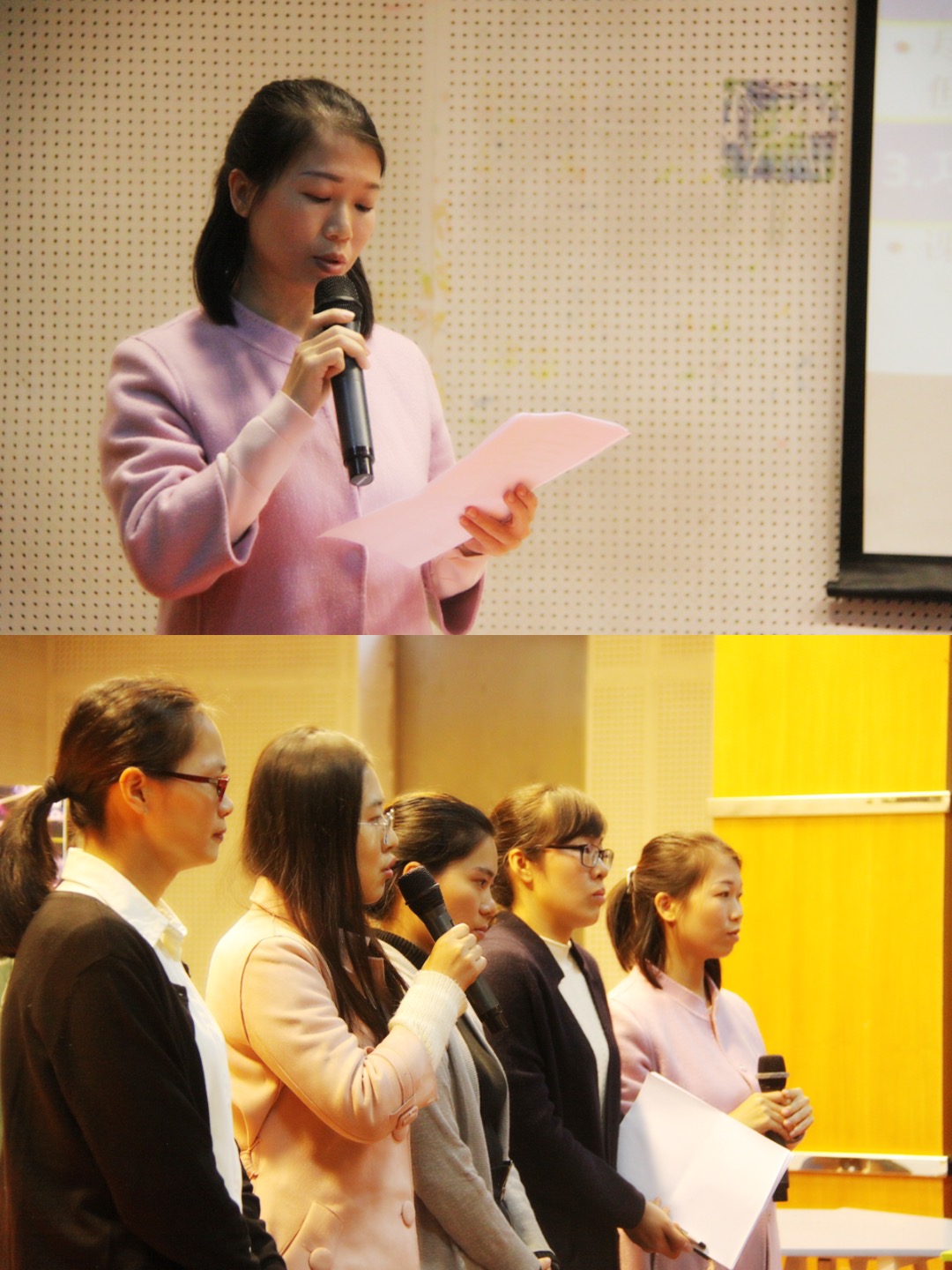 稍后,全体老师齐聚礼堂,4名教研组长分别做了背景分析、主题确定、主题开展、效果总结和反思改进的科组教研主题汇报。接着,各答辩小组团结一心,沉着机智地应答评委老师们独到的问题。最后在评委们精妙、睿智的点评中结束了上午的比赛。