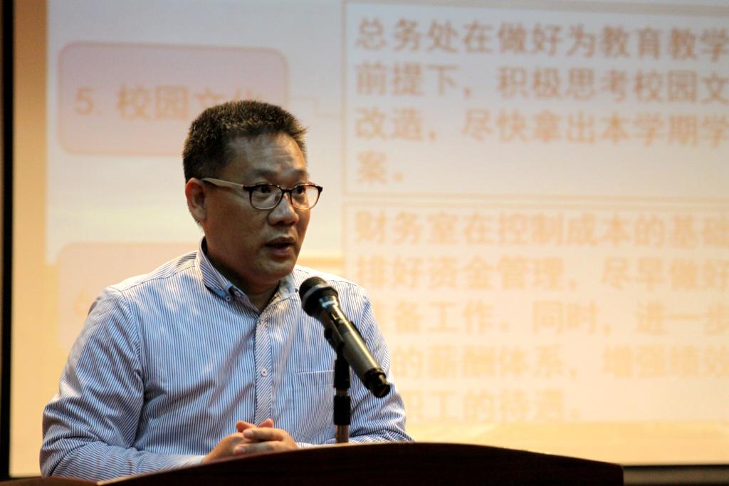 陈又新希望老师们能深刻领会吴校长的新学期工作思路,进一步明确工作方向,推进学校内涵发展,提高学校办学品位。随后陈又新在任职发言上感谢党组织的培养和关心,感谢各位老师的支持和帮助,相信在以吴玉爱校长为核心的班子的正确领导下,在党支部历任书记打下的坚实基础上,在各位教职工的大力支持下,大家一道为学校的发展贡献智慧和力量。