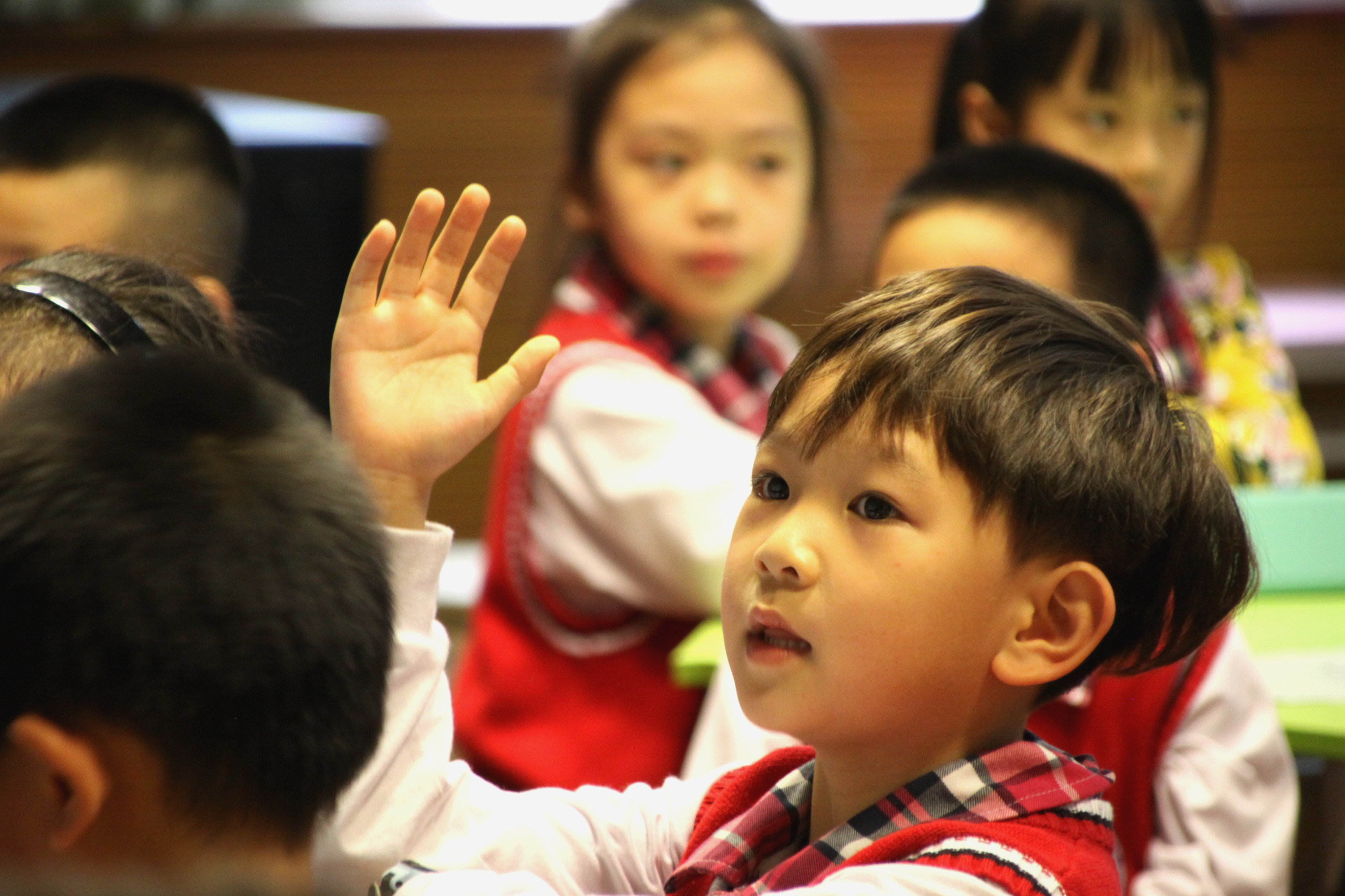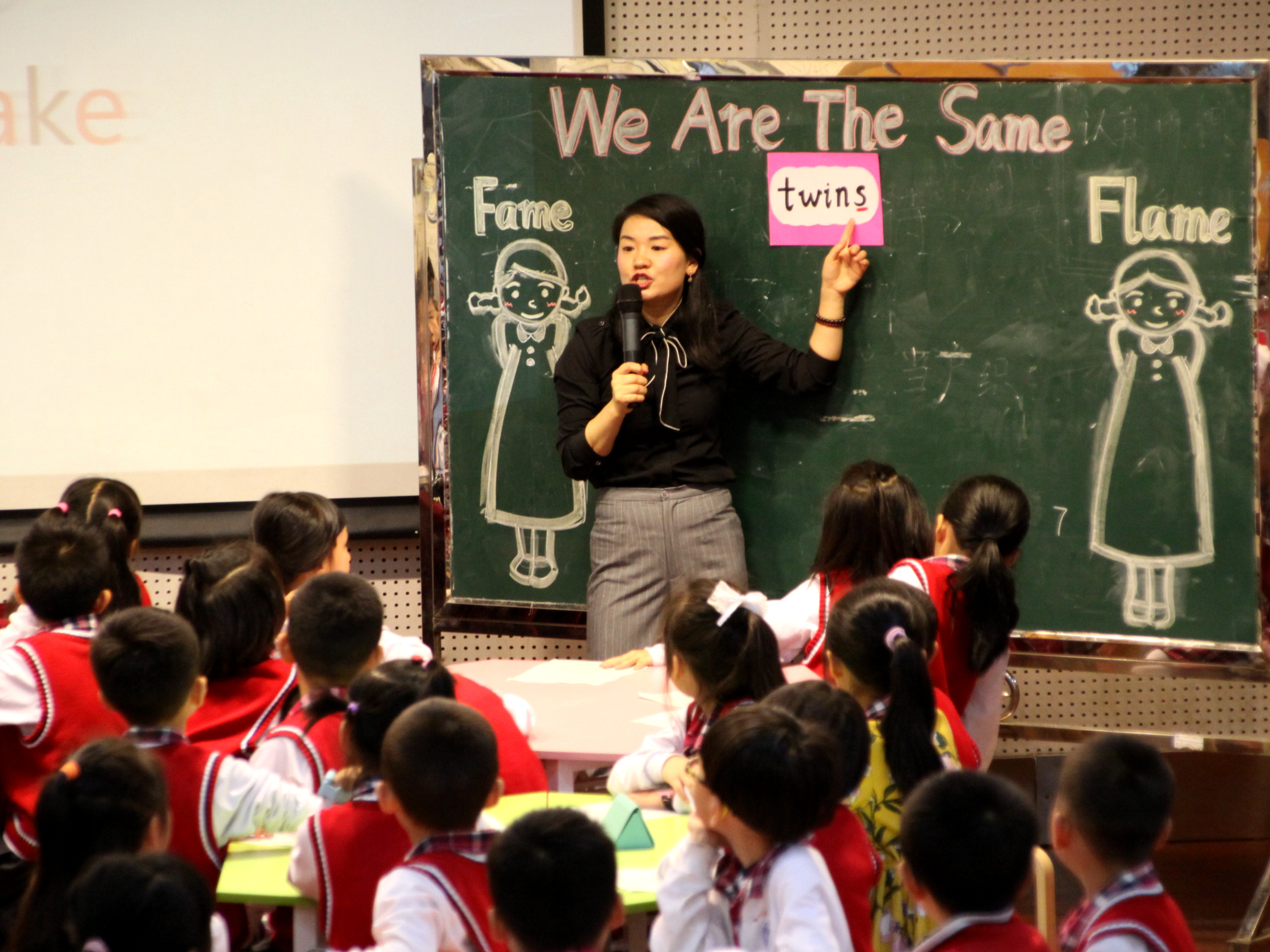 大家首先观摩了一年级周群老师执教的一堂英语课。课前邓乔之同学为来访人员带来了一场全英文小魔术,表演中还邀请台下家长上台进行互动,全程流利自如的英文获得了大家的热烈掌声。课上,周老师用现下流行的抖音视频引出本课主题《we are same》,通过班上双胞胎实例给课题画龙点睛。利用歌唱形式拼读引导,小组展示等环环相扣的环节,带领在场所有家长和小朋友共同遨游了一番英语的知识海洋。