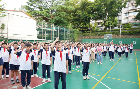 同学们跟随旋律,唱响国歌,向国旗敬礼。
