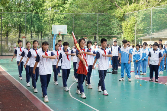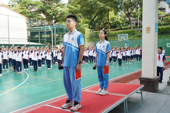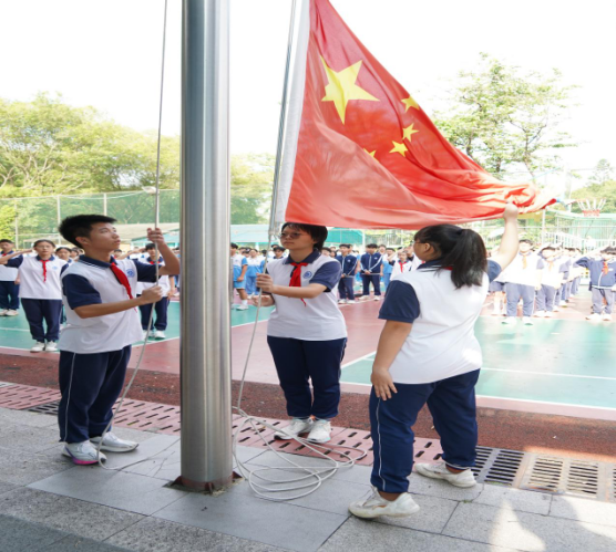 清晨,我校全体师生齐聚操场。在铿锵的出旗曲中,国旗护卫队以整齐的正步护送五星红旗,伴随着《义勇军进行曲》的雄壮旋律,鲜艳的国旗与初升的朝阳共同点亮校园。