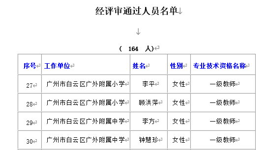 经广州市白云区中小学一级教师任职资格评审委员会 评审通过,下列同志拟取得中级专业技术资格,现予公示。若对下列同志取得资格有异议,请电话或书面向中级专业技术资格评审委员会办公室或人事职改部门反映,反映情况的电话和书面材料要自报或签署(手写)真实姓名,不报或不签署真实姓名的,一律不予受理。