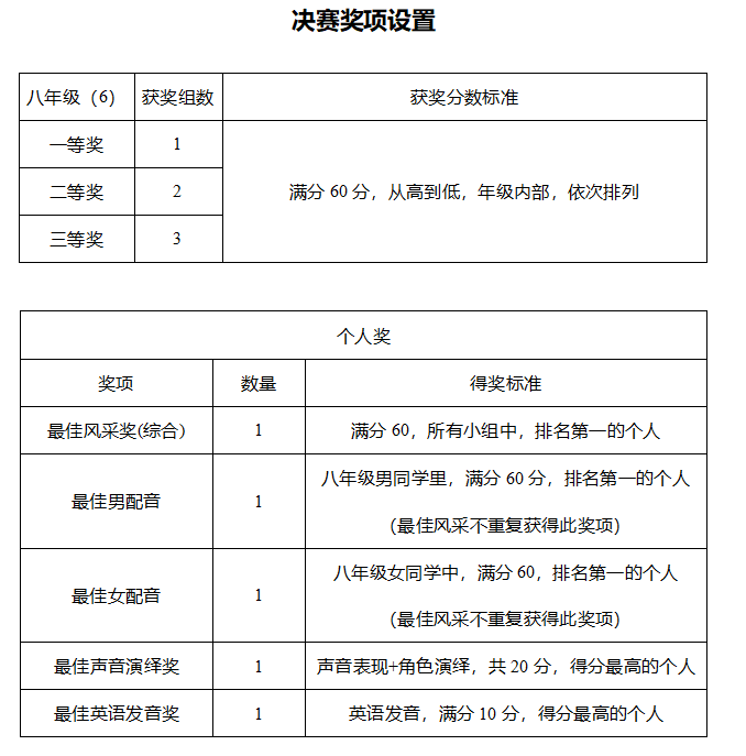 决赛最终选出一组一等奖,三组二等奖,其余为三等奖。此外,根据创意表现(如服装、道具、PPT设计、舞蹈编排等)设置最佳创意奖,根据舞台表现力和观众反响设置最佳台风奖。