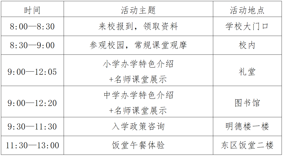 本次校园开放日活动严格落实国家、省、市招生政策,不举行任何形式的测试、面试,不收集任何学生、家长的信息,不收取学生的简历材料。
