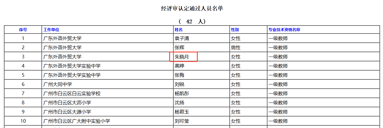 经广州市白云区中小学一级教师任职资格评审委员会评审、认定通过,下列同志拟取得中级专业技术资格,现予公示。若对下列同志取得资格有异议,请电话或书面向广州市白云区中小学一级教师任职资格评审委员会办公室或白云区教育局人事科反映,反映情况的电话和书面材料要自报或签署(手写)真实姓名,不报或不签署真实姓名的,一律不予受理。