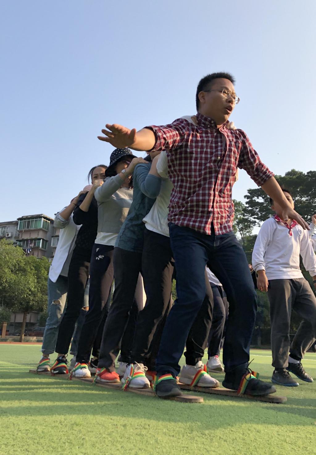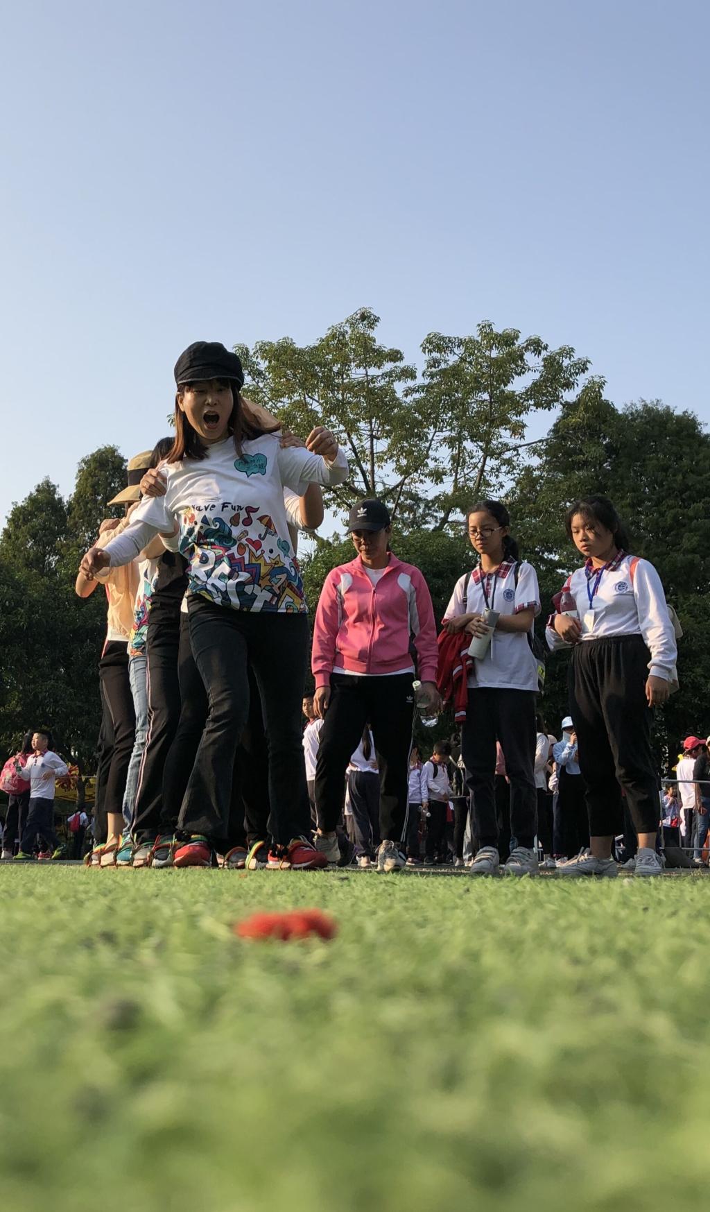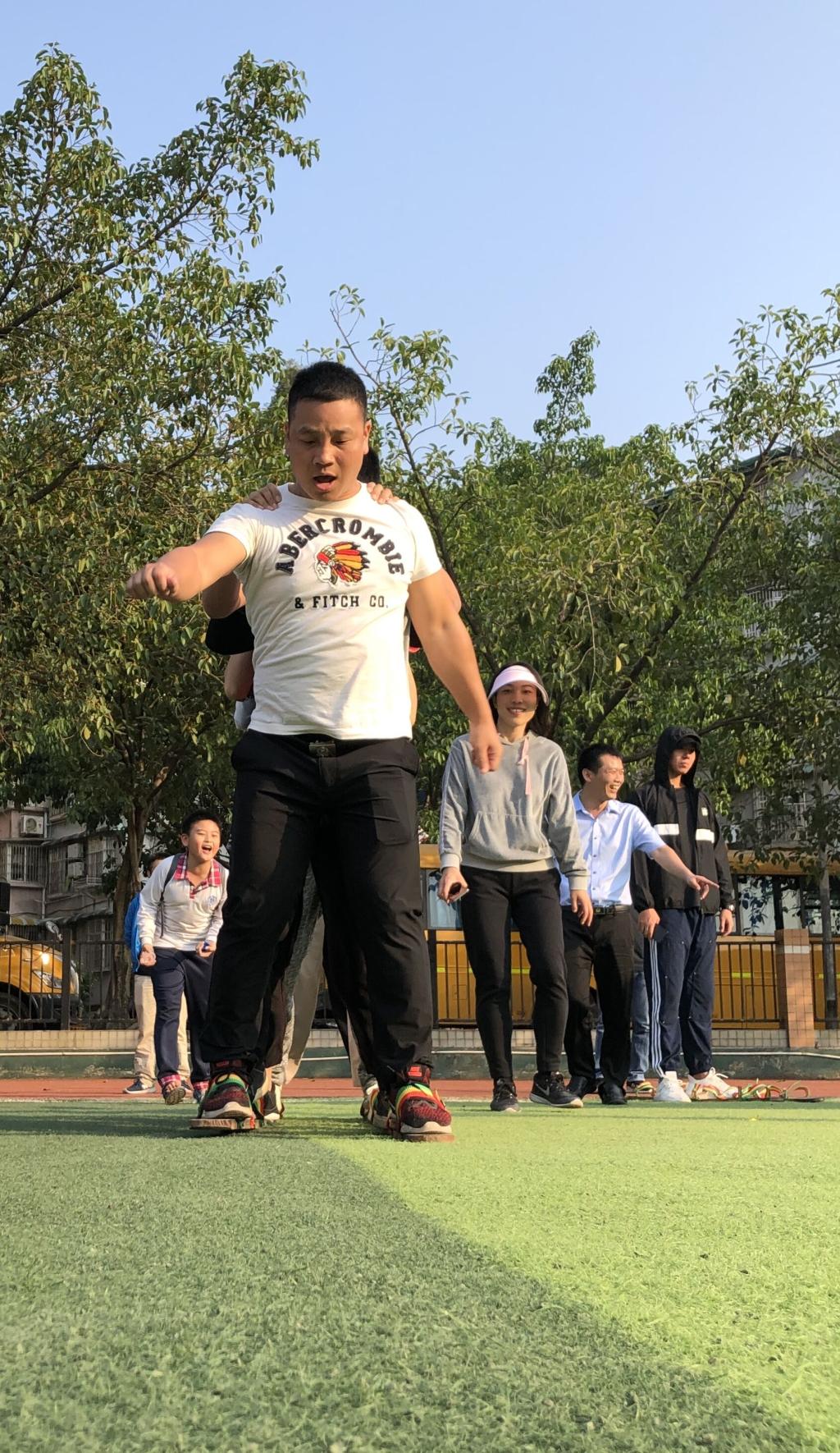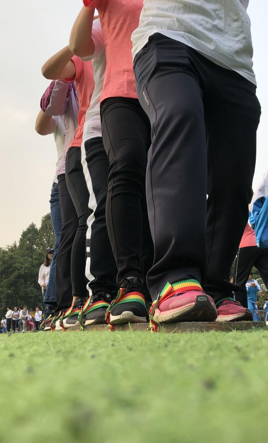 我们每个人都有一双脚,日常生活中我们都可以很自如地去操控它们,假如将你的双脚与第二个人、第三个人,甚至更多的人的脚绑在一起时你还能自如的操控它们吗?伴随着“左、右、左、右”的口号声,同舟共济大脚板比赛分别在14和15日下午分小学、中学进行,参赛10支队伍的老师们将双脚分别站在两块木板上,步调一致地向前冲去。