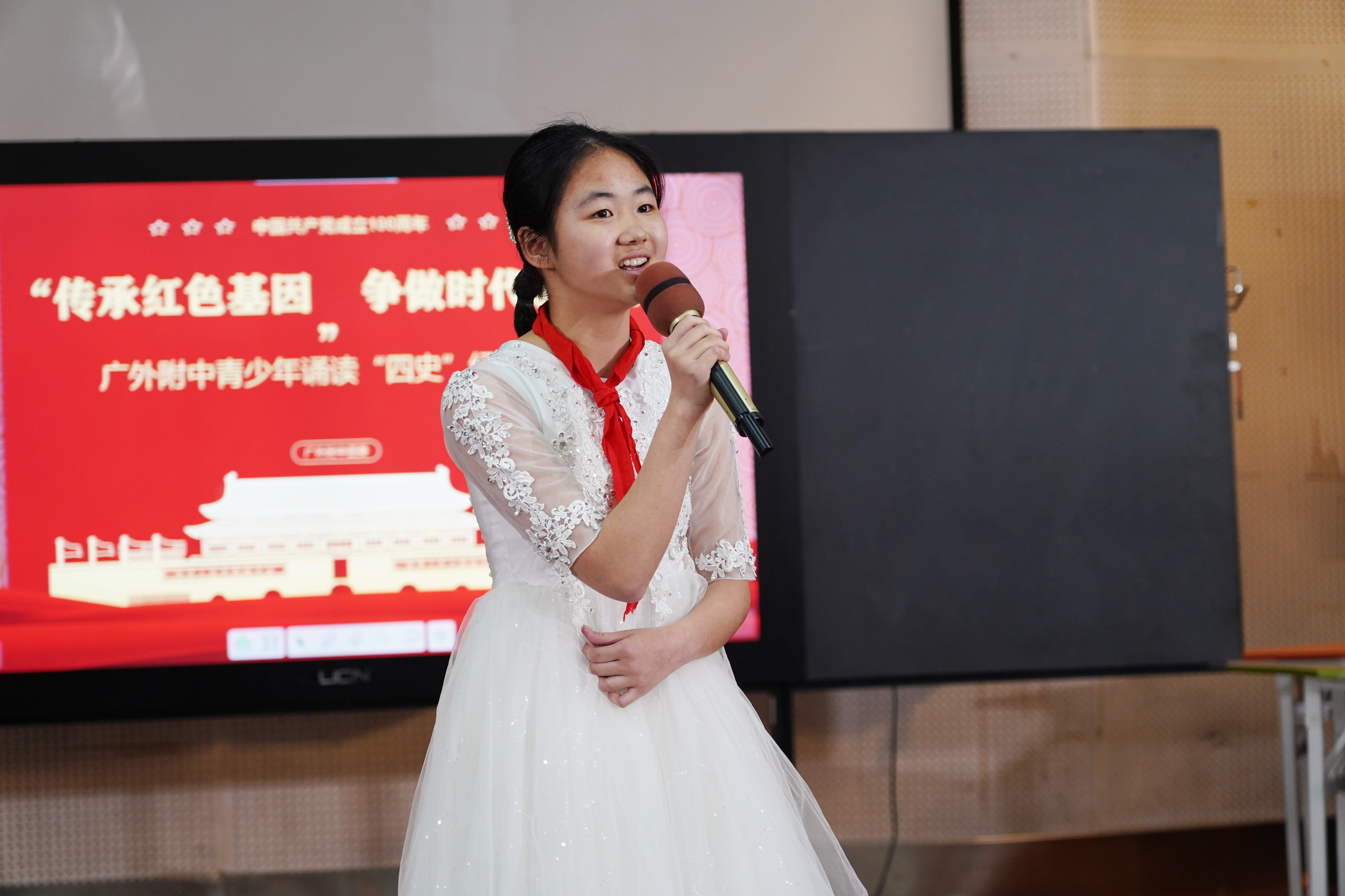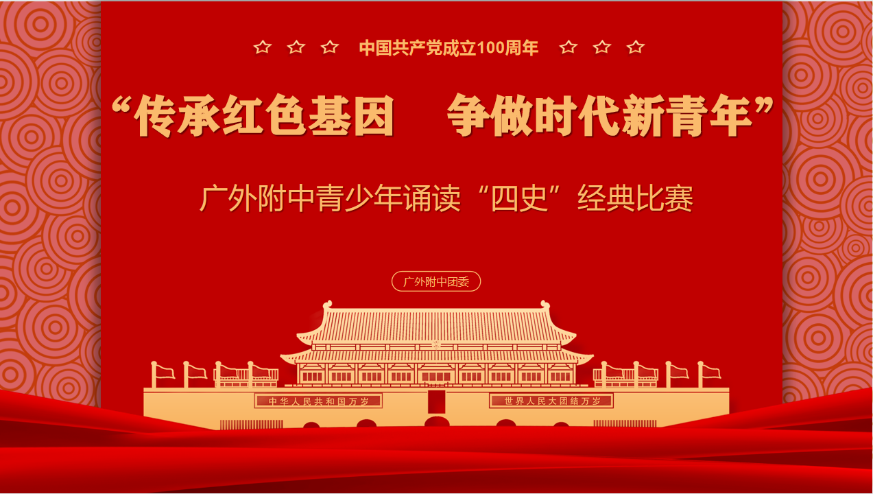 为深入贯彻习近平总书记在党史教育动员会上的讲话精神,广外附属中学广大青年中掀起了学习党史、新中国史、改革开放史、社会主义发展史(下简称“四史”)的热潮。为此,校团委组织了以“传承红色基因 争做时代新青年”为主题的诵读“四史”经典比赛。