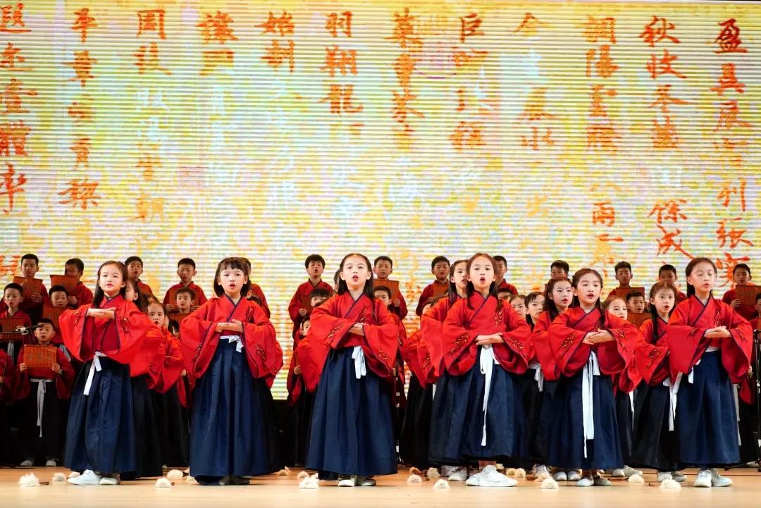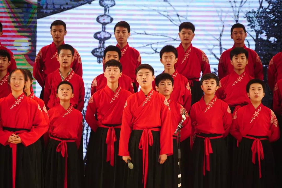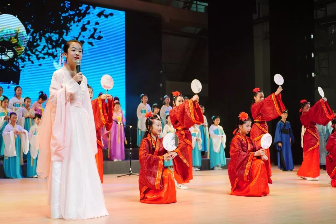 全校一至八年级全体学生悉数登场,表演中,学生们的诵读字正腔圆、有板有眼,在浅吟低唱中演绎了中华经典诗词的独特韵味,让整个会堂充满了传统文化的馨香。