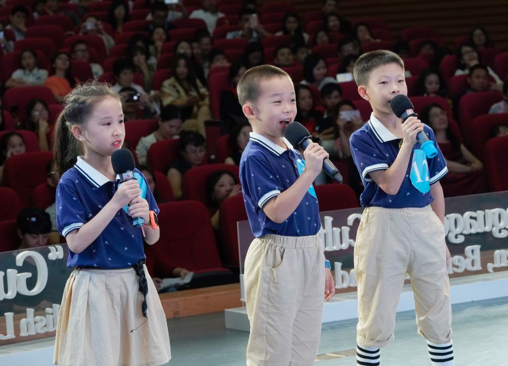 总决赛分四个环节。“即兴绘本配音”环节的参赛者为小学1、2年级的学生,他们在上台前通过抽签决定表演的绘本,自行分配角色并准备,准备时间仅30分钟。然而我校二年级的刘梓乐、邓乔之、李子墨三位小朋友沉着冷静,配合默契,稚气未脱却又标准流畅的配音获得了在场观众的阵阵掌声。
