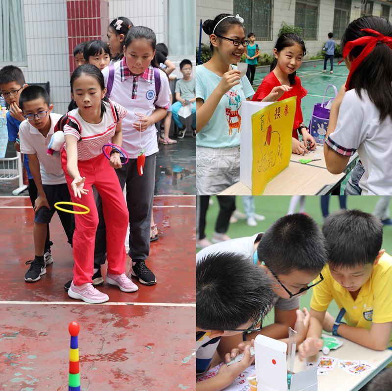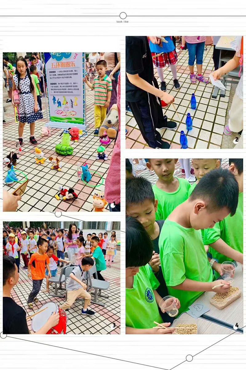 游园活动开始了,校园里热闹起来了,孩子们笑着、跳着,欢欣雀跃的奔向自己喜欢的游戏。每个班的游戏都很有特色:套圈、吹乒乓球、抢凳子、双人夹气球……游戏过关的还可以领取兑奖劵,这让游园会增加了不少乐趣,人群中不断传出阵阵欢笑。兑奖处人头攒动,孩子们三五成群,挥动着手中各种各样的小奖品,眼里闪动着兴奋的光芒。