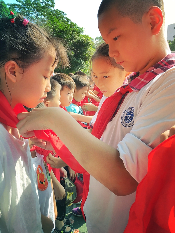 高年级队员们为新队员佩戴上了鲜艳的红领巾