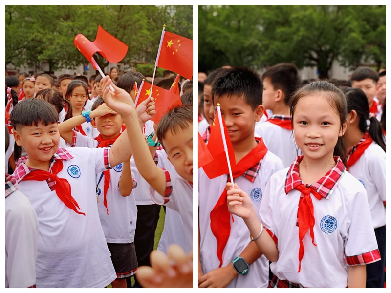 随着悠扬的旋律响起,在音乐老师和合唱团同学的引领下,全校2300余名师生挥舞着手中的五星红旗,整个操场一时变成了红色的海洋。