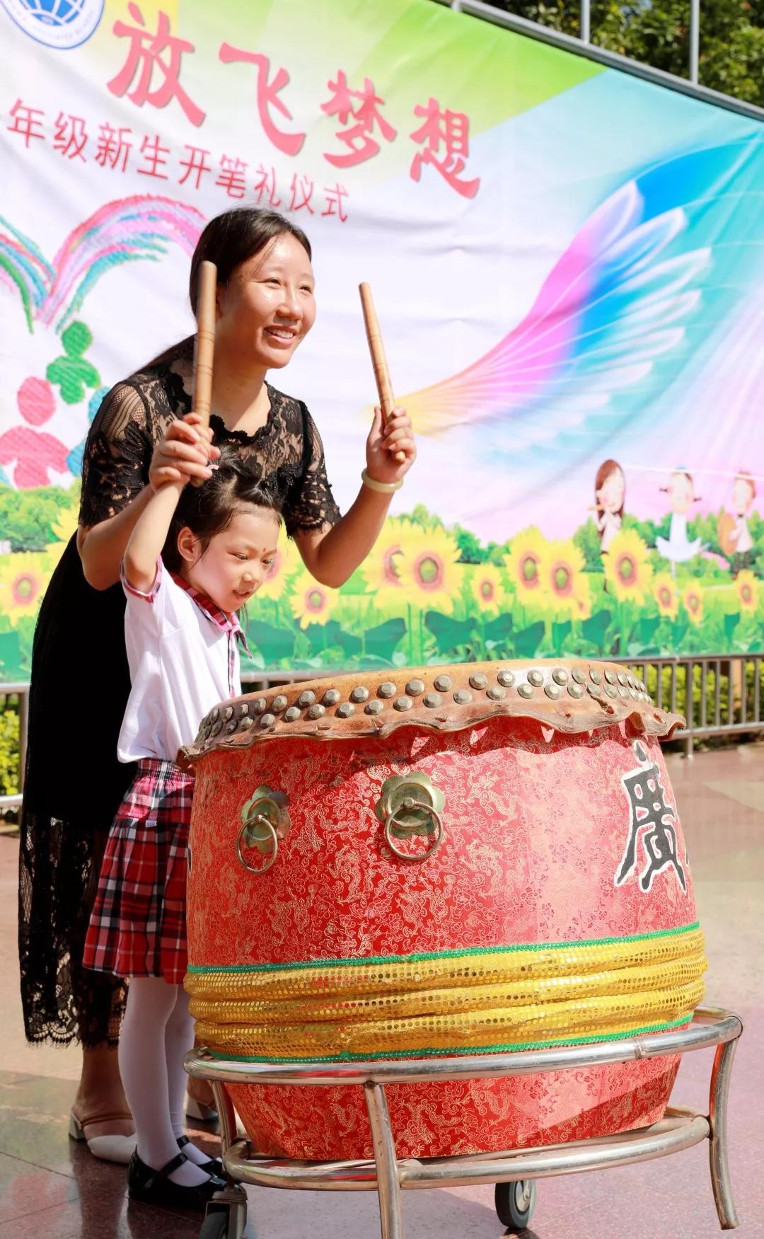 “击鼓鸣志”是古代读书人去考取功名时,通过击鼓的方式,表达他们要读书上进和考取功名的愿望。一年级学生代表吕佳桐同学在级组长刘靖老师的带领下,依次击鼓三声,同学们伴随着“咚咚”的鼓声,心中默念着自己美好的愿望。鼓声传递心愿,鸣响同学们远大的志向。