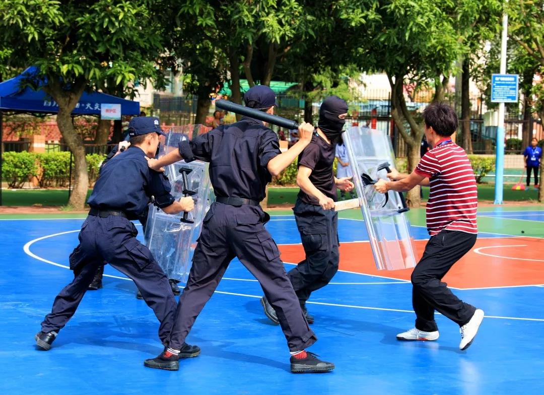 一位“暴徒”闯进校园,试图“砍杀”学生,同学们快速远离“暴徒”并大声呼救,学校护卫队闻声出动,钢叉、盾牌齐上阵,武警官兵也随即抵达现场,最终“暴徒”被制服。
