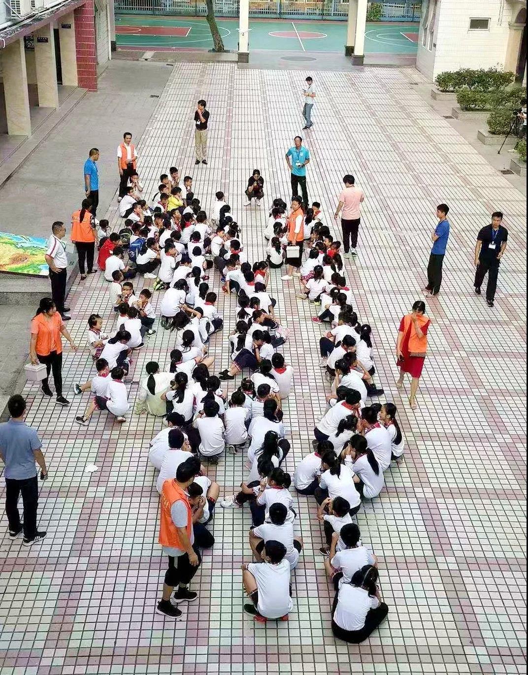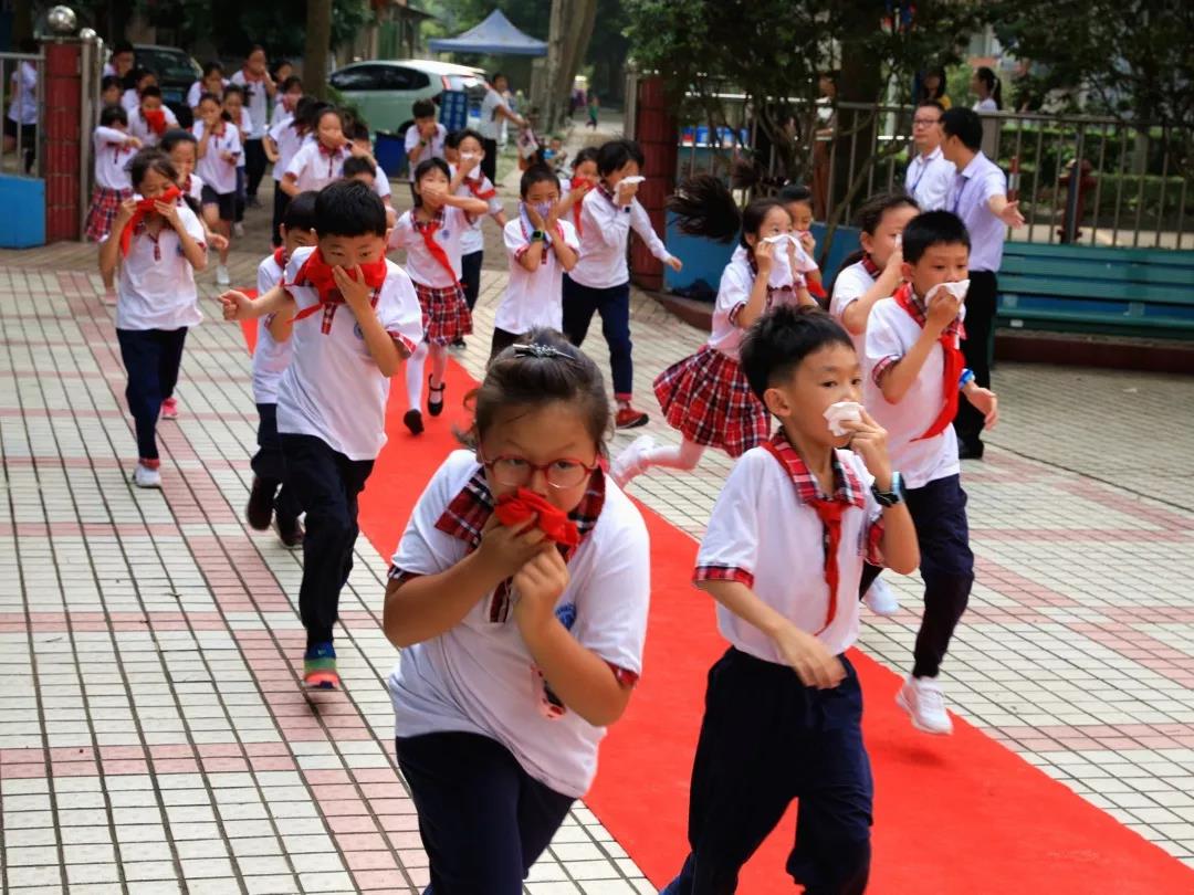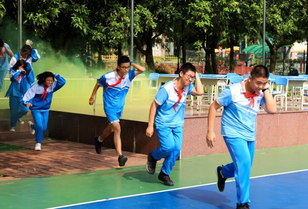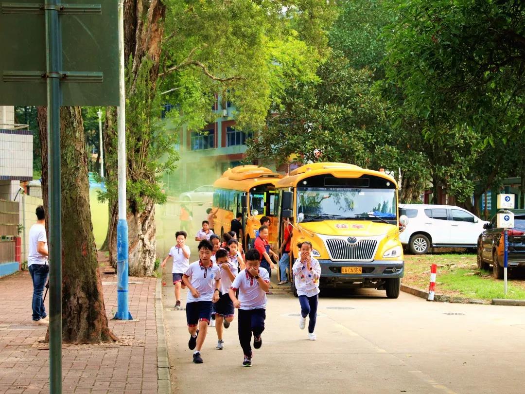 10:10,校内猛然响起几声巨大的爆炸声,浓烟弥漫了整个校园,原来学校里突发“火情”和“地震”了。警报声顿时响起,各班老师迅速组织学生从教室撤离,只见同学们有的猫着腰、抱着头,有的用手、袖子捂住口鼻,紧张、快速、有序地按预定的疏散路线到达大操场。全校2100余名师生,用时不到4分钟就全部到达了安全区域。