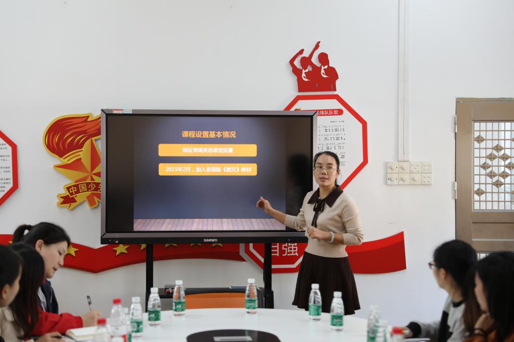 中学吴文凤老师则代表中学英语科组,分享了我们学校初中老师参与的常规活动,以及学生平常的常规课堂活动安排和课程设置等。吴老师重点分享了《典范英语》如何实施使用,以及我们在活动和课堂中是如何注重学生思维品质的培养。吴老师的分享用到了我们英语科组老师很多平常上课所使用的课前三分钟,学生制作的精美的手抄报,阅读分享课时学生分享的视频和课件等,理论支撑,实例点拨,与会者都听得很认真。专题报告后,河外的老师们和我校的中学老师就教学实际中的一些具体问题进行了热烈的讨论。