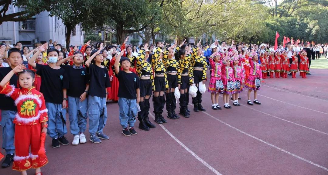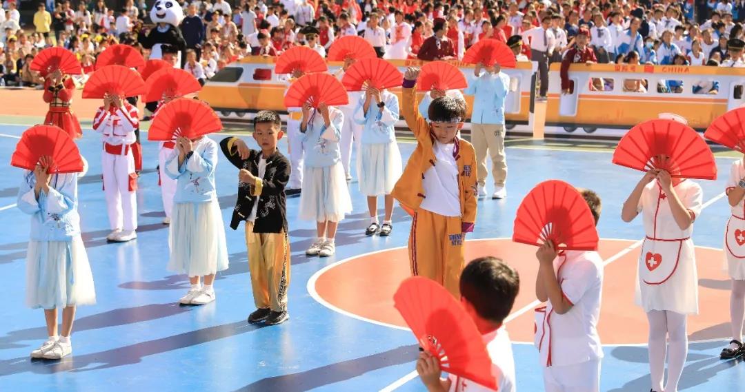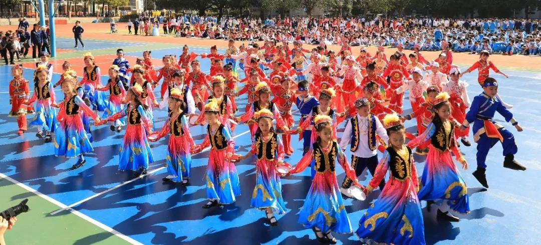 五年级组婀娜多姿的新疆舞和中华武术开场,街舞少年和古风少女一起演绎着我运动,我健康,做身心健康全面发展的学生。