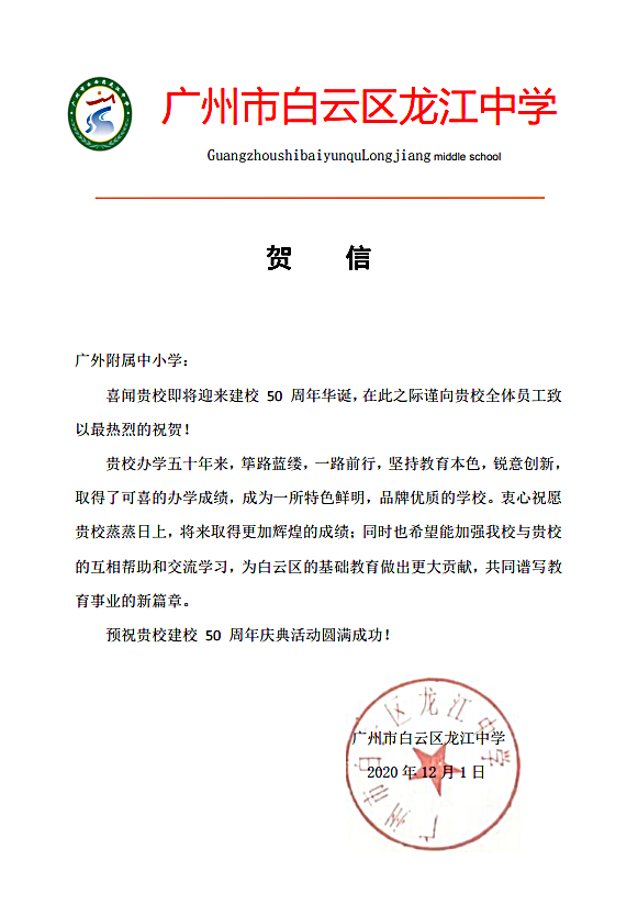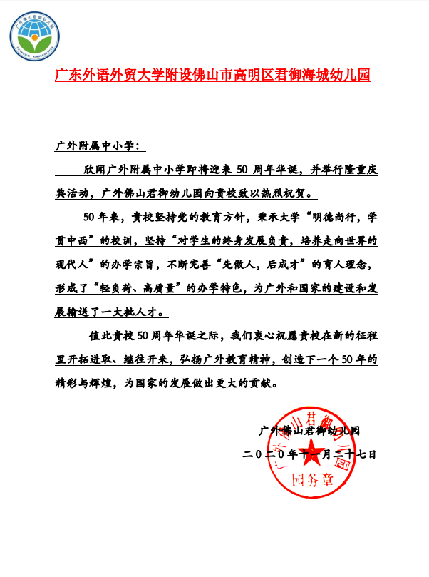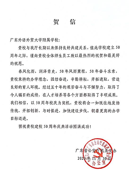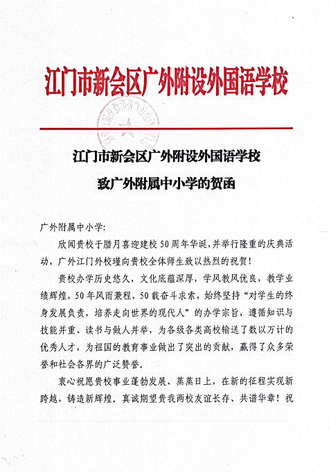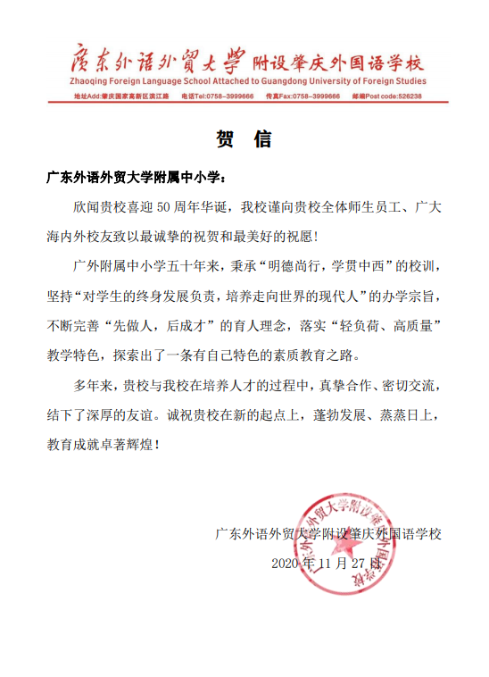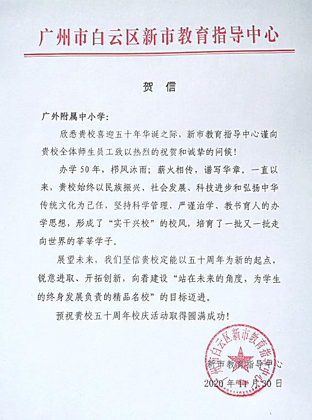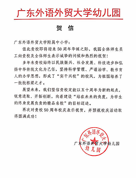 在过去的50年里,广外附属中小学得以持续稳健发展,不仅依靠全体员工的耕耘和付出,还离不开各级领导的亲切关怀和社会各界友好单位的大力支持。值此50周年校庆之际,前来学校祝贺的领导、友好单位、热心人士络绎不绝。