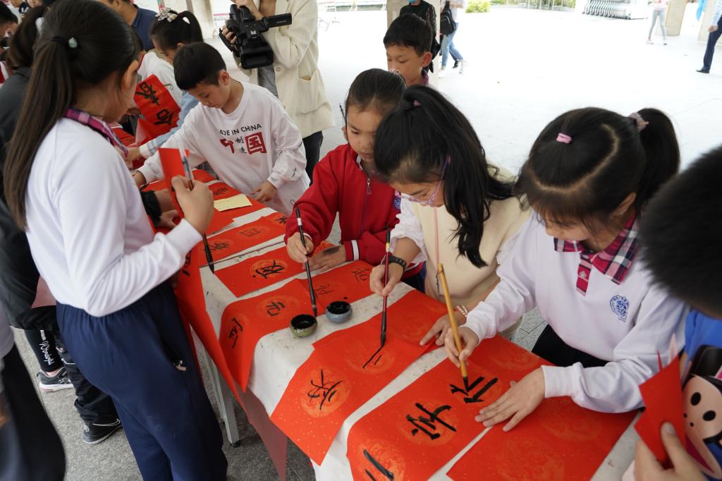 “无联不成春,有联春更浓。”学校早已为师生们准备好“文房四宝”,在老师的指导下,同学们挥笔泼墨,一个个福字,一幅幅对联应运而出。现场的欢声笑语与翰墨飘香相互交织。同学、老师、家长们一起书写油墨飘香的春联,张贴在校园里,用自己的才艺和爱心为校园装点了别样的风景。