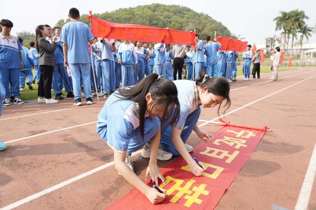 师生们还在横幅上签下了自己的名字。我们相信:挥洒汗水必将让六月的果实更加饱满,奋力拼搏必将让六月归航的凯歌更加嘹亮。