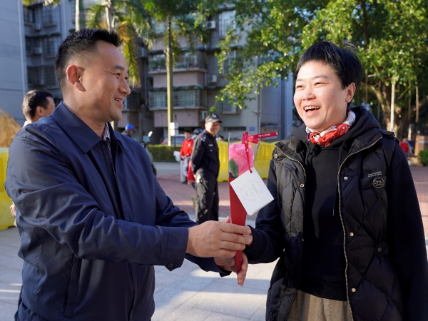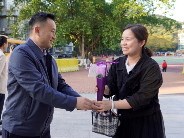 今天,伴随着白云山下丝丝的凉意,附校“男神”们一大早就在学校门口等待着给“女神”们送惊喜。方建军校长、涂筱辉书记、袁宇迪副校长给每一位附校“女神”教师送上节日的问候和诚挚的祝福,并亲手献上精致又实用的毛巾花。