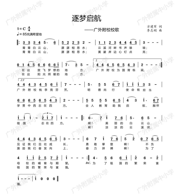 "青青白云山,潺潺相思水,云溪河畔书声琅琅。在这放飞梦想的地方,广外附校为国育栋梁"......伴随着清脆悠扬的童声小合唱回荡在白云山脚下,我们这所有着52年办学历史的广外附校,终于有了自己的校歌——《逐梦启航》。