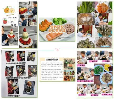 五至六年级学长以技能为基,让劳动承载责任与文化。食育烹饪任务中,创意餐食搭配精妙,主食、配菜与饮品相得益彰,水果拼盘造型别致,过程与成品影像完整呈现匠心;公益劳动拓展中,劳动技能科普手册干货满满,社区服务身影忙碌暖心,校园公益行动传递正能量,尽显小小少年担当;跨场景文化创新里,家庭低碳改造方案科学可行,传统劳动技能实践韵味悠长,实物作品与文字说明相映成趣,让劳动与文化、创新深度融合。