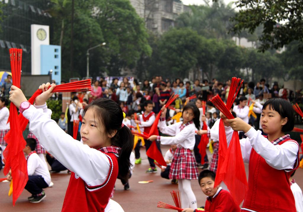 随后,家长们带领着小朋友们来到大操场,观看特色的大课间活动筷子操,1000多名师生齐聚大操场,他们整齐的挥舞着筷子,筷子声铿锵有力的回响在整个校园,引来参观的家长和小朋友们围观拍照。