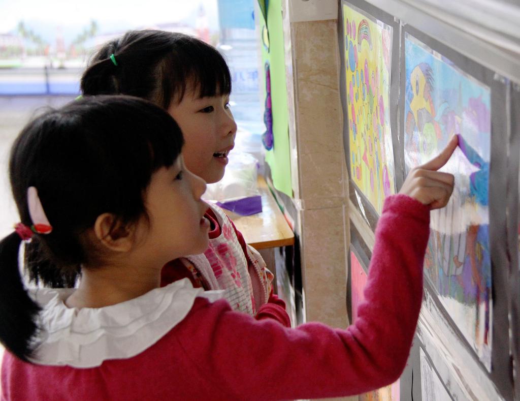 两个小朋友对大哥哥大姐姐们的画展格外感兴趣