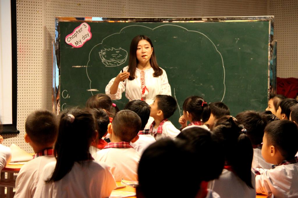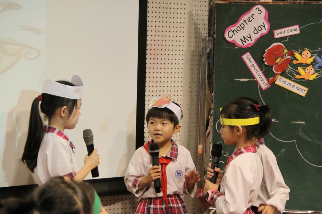 在云山礼堂二年级喻安婷老师执教的英语课《my day》上,同学们课前3分钟展示后,以《诗经》为载体,认读phonics字母组合ee, ea, ay,复习sigh words,用sight words(高频率词汇)降低故事中阅读难度,用思维导图引导学生复述故事,用小组合作进行故事演绎,展示了一节英语阅读课,创意满满、歌声悠扬,不绝于耳。在座家长和小朋友融入了欢乐的课堂氛围,看到哥哥姐姐们端正的坐姿,看到了老师情境性的教学形式,小朋友们无比兴奋,更有一种想融入其中的冲动。