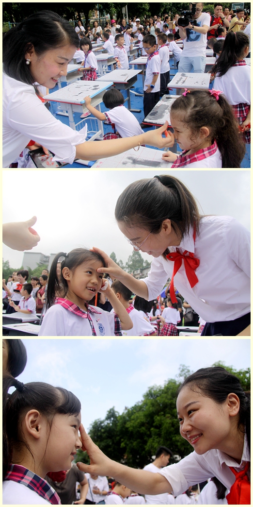 朱砂启智寓意开启智慧,从此眼明心亮,发奋读书。老师们分别用红色的朱砂在同学们的额头正中点上红痣,希望同学们耳聪目明、茅塞顿开。看孩子们认真的样子,红痣不但点在他们的额头上,更烙印在心中。