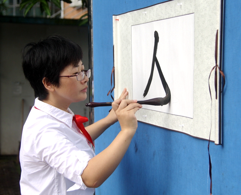 家长们握着孩子们的小手指导他们写下人生第一个“人”