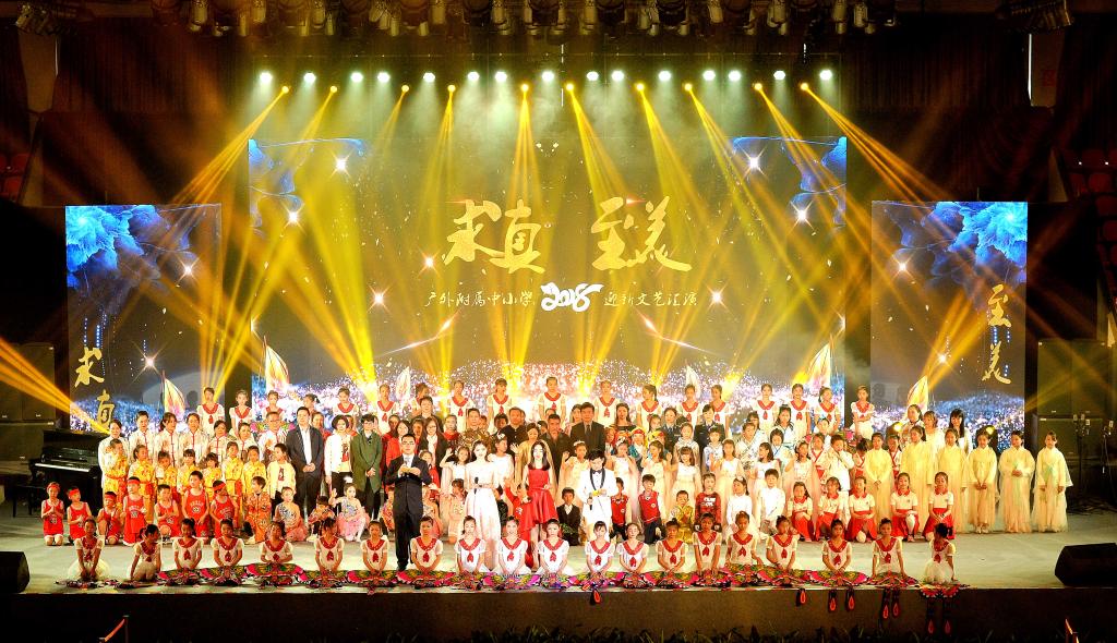 本网讯 12月26日,一年一度的迎新年文艺汇演在广东外语外贸大学北校区体育馆举行。本次演出主题为求真·至美,节目形式多样,有歌曲、舞蹈、朗诵、相声、武术和器乐合奏等,师生、家长和嘉宾同台演出,有900多人次参与了节目的表演,创下了历年演出人数之最。现场气氛热烈,座无虚席,掌声雷动。