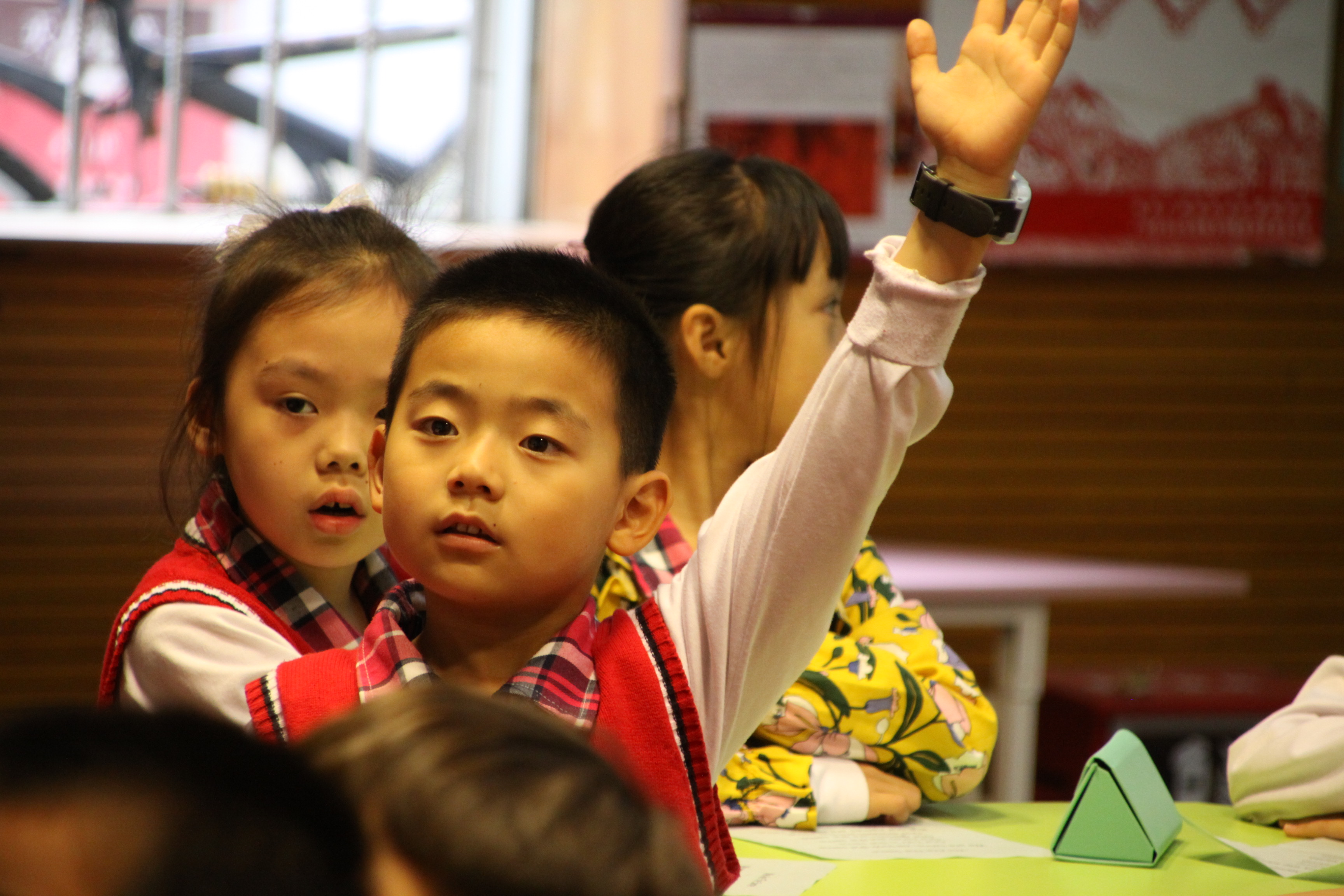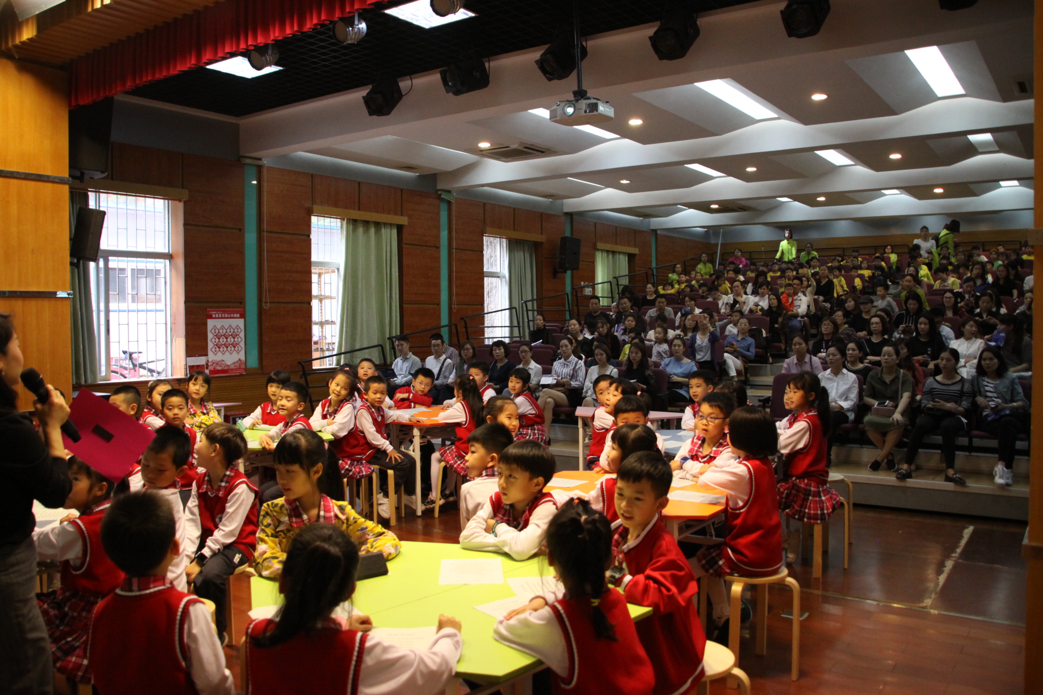 大家首先观摩了一年级周群老师执教的一堂英语课。课前邓乔之同学为来访人员带来了一场全英文小魔术,表演中还邀请台下家长上台进行互动,全程流利自如的英文获得了大家的热烈掌声。课上,周老师用现下流行的抖音视频引出本课主题《we are same》,通过班上双胞胎实例给课题画龙点睛。利用歌唱形式拼读引导,小组展示等环环相扣的环节,带领在场所有家长和小朋友共同遨游了一番英语的知识海洋。