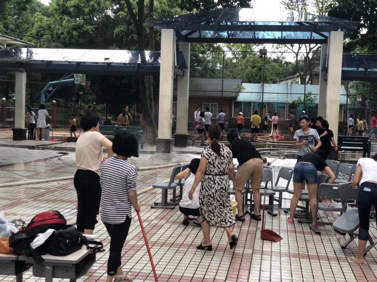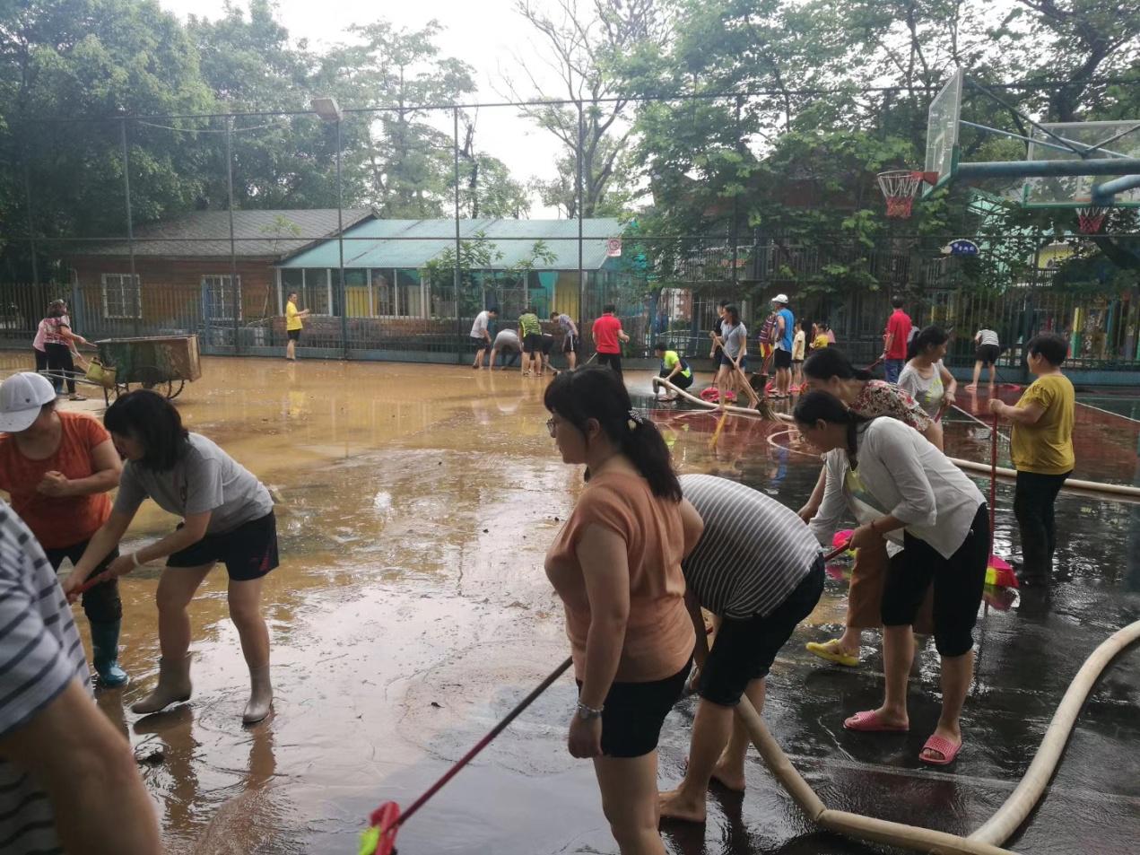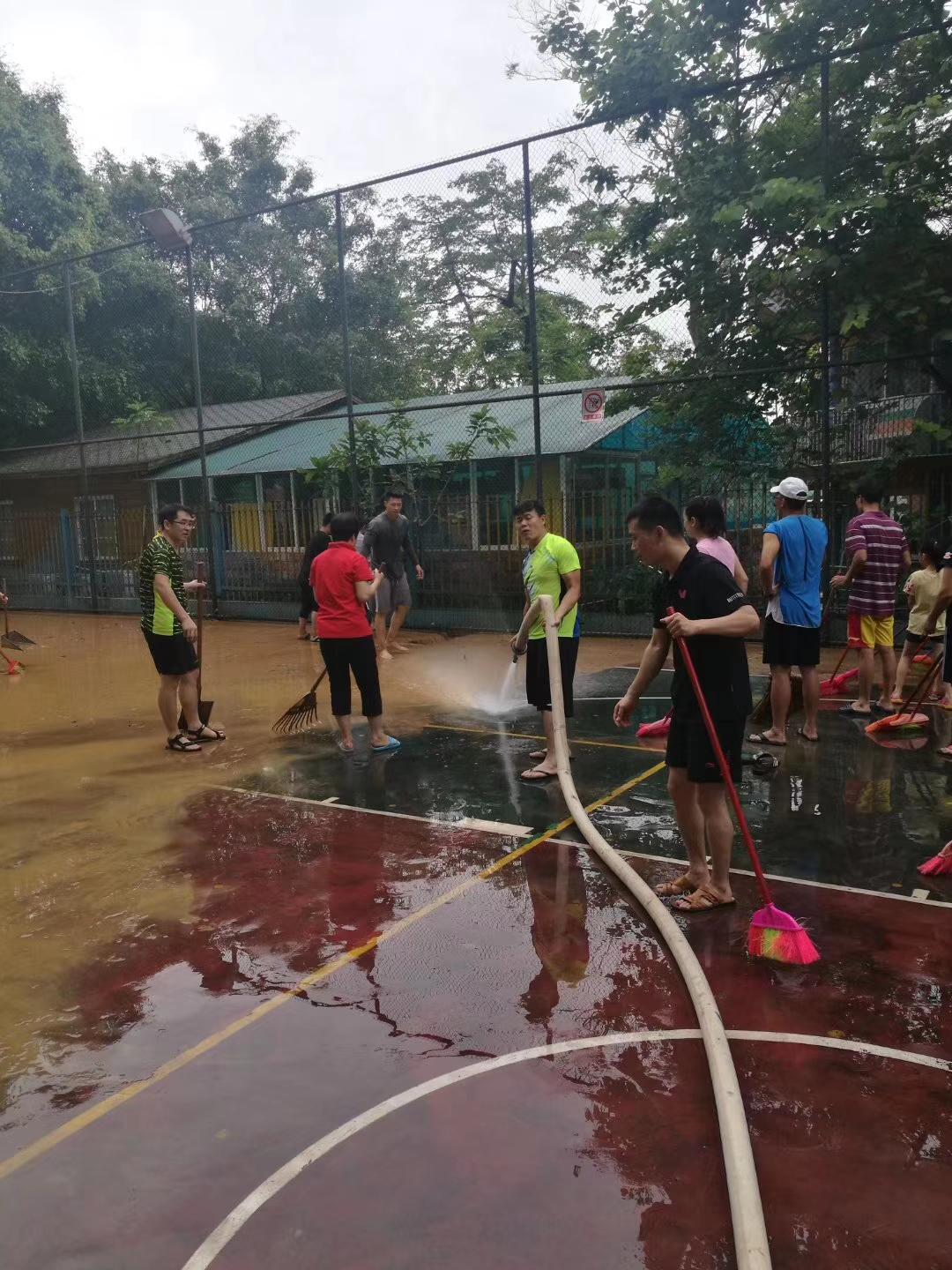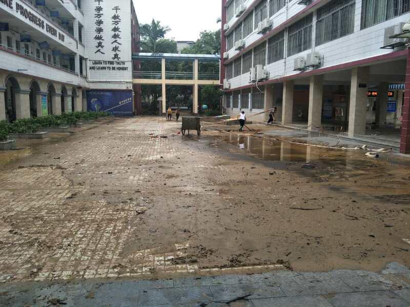 灾后清淤工作特别繁重。6月9日,全校大部分教职工及部分学生和家长自愿返校清除淤泥,冲洗校园。近两天的辛勤劳作,淤泥终于清理干净了,各个课室也进行了消毒处理。在大家的共同努力下,校园又重现了往日的美丽。