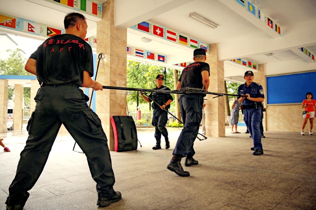 下午,我校由体育教师和后勤人员组建的教职工校园护卫队跟随广东警官学院的教官们进行防恐防暴技能训练。黄教授逐一向队员们介绍了护盾,钢叉的使用原则与技巧。现场由战术协会的警官们将队员们分成小组,进行每个技能的一对一学习与训练。通过一下午的认真学习,我校护卫队成员学习到了一整套的擒拿治敌策略。