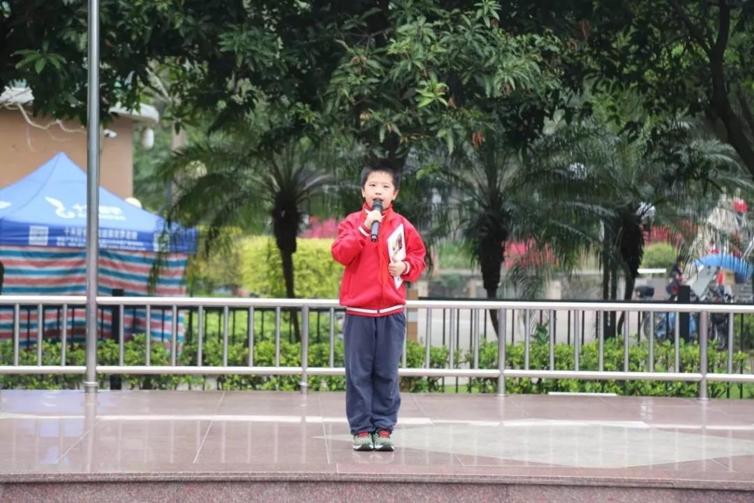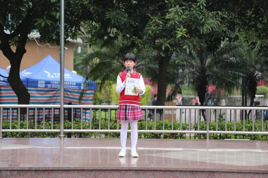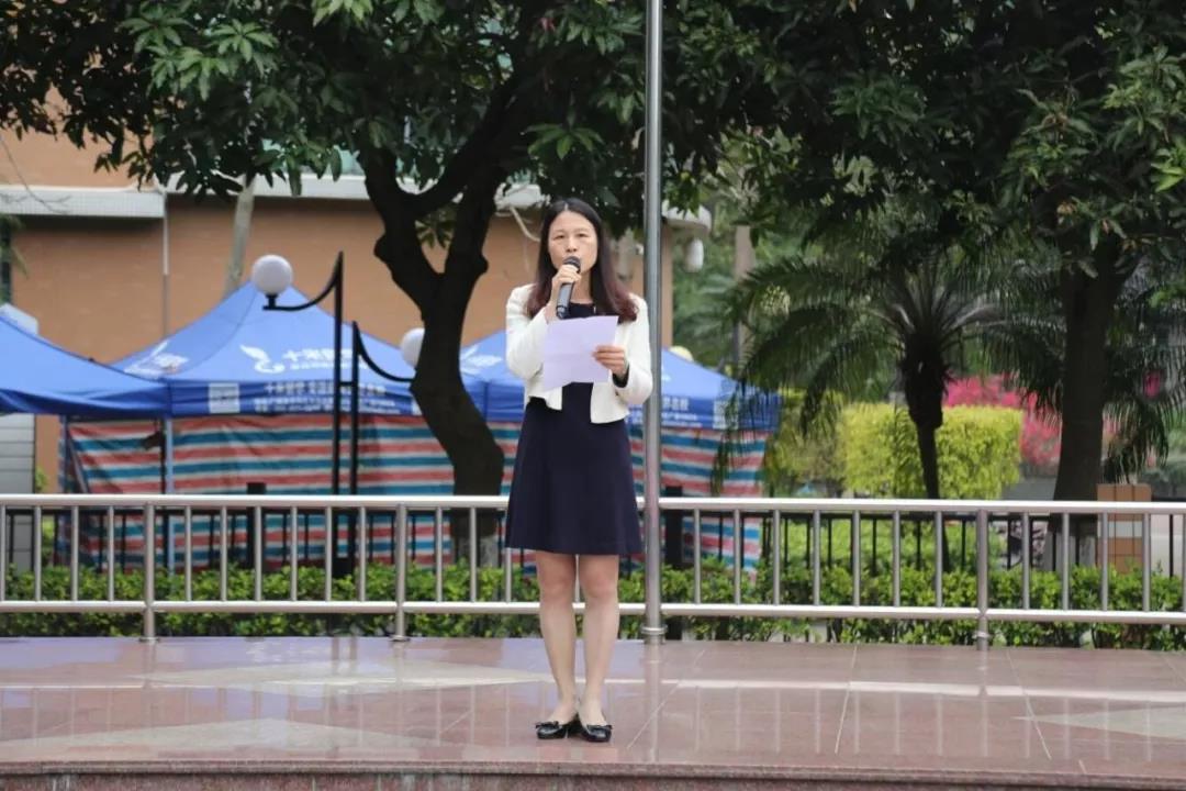 小学教学处黄哲昙主任在国旗下发表了热情洋溢的讲话。她引经据典,阐述了读书的重要性。鼓励学生多读书、读好书,在阅读中建立自己丰富的精神家园。她还详细介绍了本次读书活动具体安排:每一位语文老师将在班级进行读书指导,每一个年级都有独具特色的读书活动。这里既有同学们喜闻乐见的“绘本故事创作”,又有考验口才的“演讲比赛”;有展示综合实力的“知识争霸赛”,也有妙趣横生的“汉语英雄季”。4月19日,全校还将举行隆重的经典诵读展演。丰富多彩的活动,让大家充满期待。最后,她宣布:“2019年广外附属中小学第十一届读书节正式开幕!”