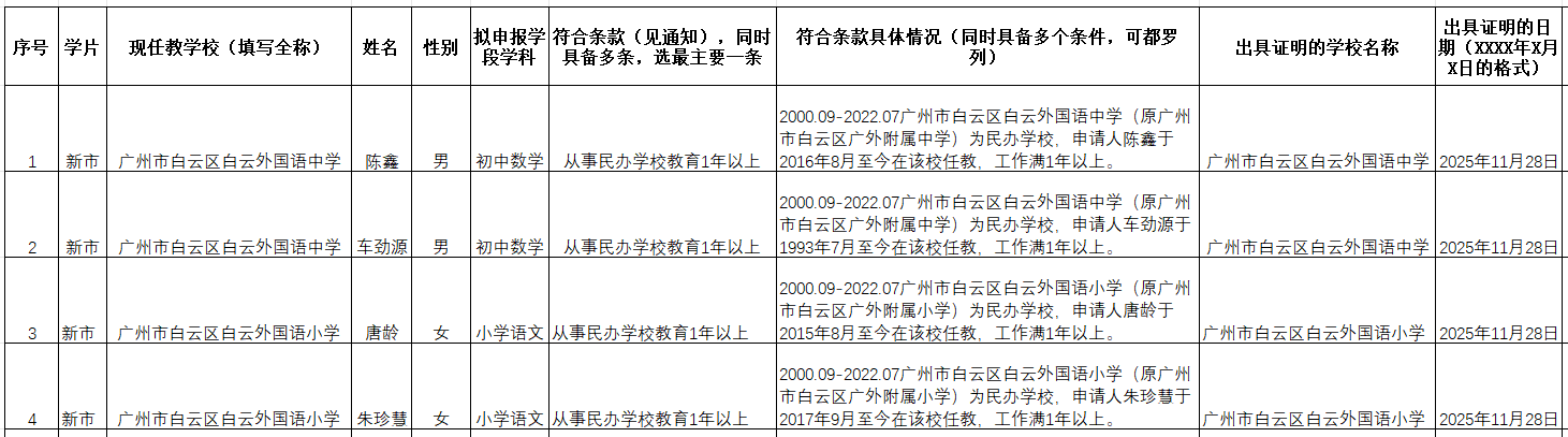 根据《广东省中小学教师职称评价标准条件》(粤人社规〔2022〕30 号)要求,申报中小学教师正高级、高级职称,城镇中小学教师要有 1 年及以上在薄弱学校或农村学校任教经历,现就我校申请人2025年度高级(正高级)教师农村或薄弱学校任教经历进行公示。