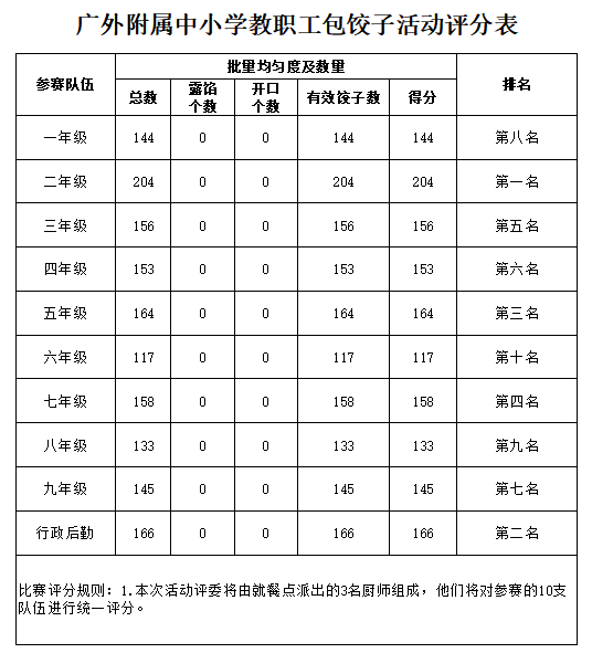 “饺”动你行,今年冬至,你们就是主饺!本次比赛不仅要求包得好,更要包得快。最后二年级组以有效饺子数204个获得第一名,行政后勤、五年级、七年级、三年级、四年级分别获得第二至六名。此外,一年级、二年级、行政后勤的饺子辨识度极高,获得“最佳创意饺子奖”;八年级、九年级、行政后勤的饺子则馅多皮薄、唇齿留香,获得评委的一致好评,获得了“最美味饺子奖”。