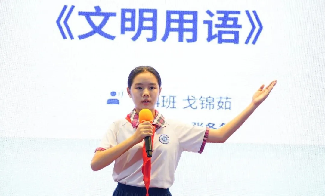 紧接着,六(4)班戈锦茹同学的主题表演《文明用语》温情上演。她以生动的语言、真挚的情感,通过情景演绎的形式,分享了文明用语在人际交往中的重要意义,让同学们深刻体会到 “良言一句三冬暖” 的温暖力量。