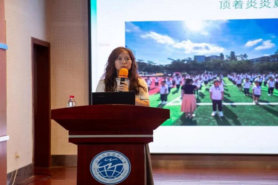 级长陈柳妤老师上台讲话,将文明习惯比作成长“好朋友”,叮嘱同学们从点滴小事养成良好品行,为低年级的学弟学妹树立好榜样。