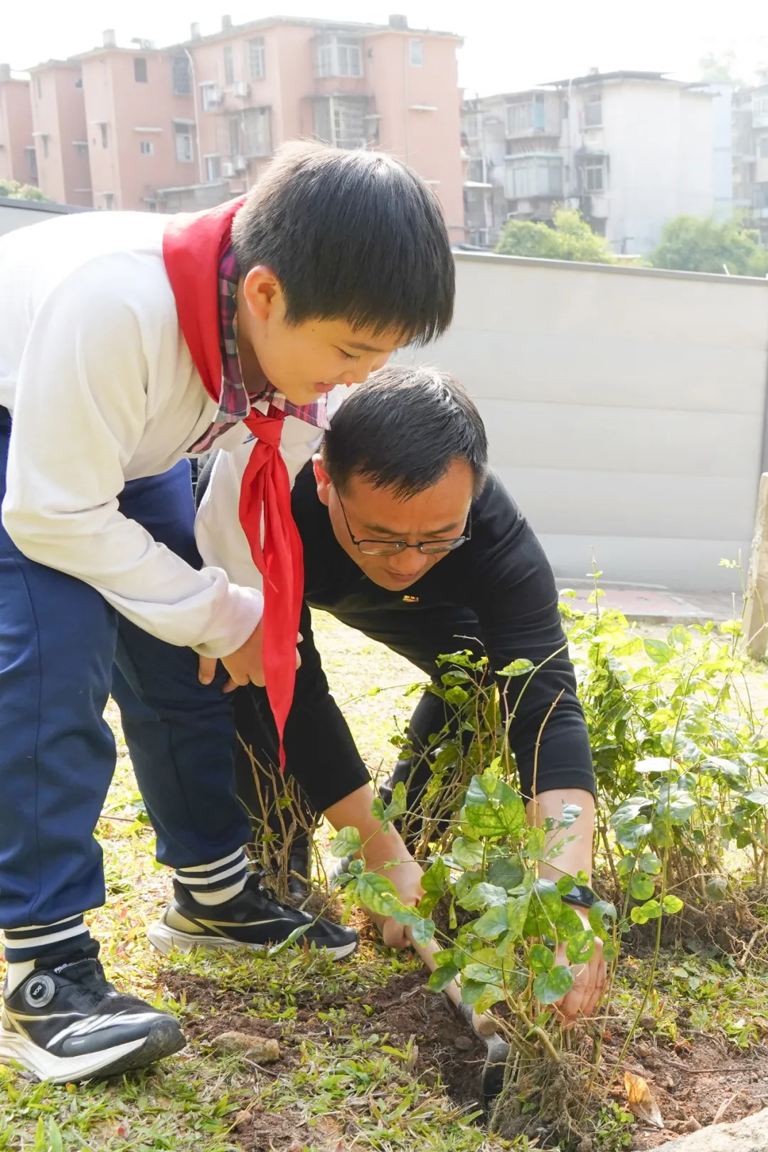 活动现场,党员教工充分发挥引领作用,一边示范种植技巧,细致讲解挖坑深度、培土方法等关键要点,一边监督安全操作,时刻提醒大家遵守工具使用规范,挖坑时保持1米间距,确保每一位参与者的安全。团员们专注负责桂花树的种植,挽起衣袖、奋力挥锹,小心翼翼地搬运树苗、调整树苗角度,精准完成固定树干、捆绑支撑木桩等体力活,动作娴熟有力,尽显团员的责任与担当;少先队员们则承担起小型花草的种植任务,俯身细致栽种茉莉、万寿菊、海棠等幼苗,小心翼翼地培土、抚平土壤,缓慢浇水,生怕损伤娇嫩的花苗。党、团、队成员分工协作、默契配合,在实践中凝聚团队力量,完美践行“大手拉小手”的活动理念,欢声笑语久久在生态园周围回荡。