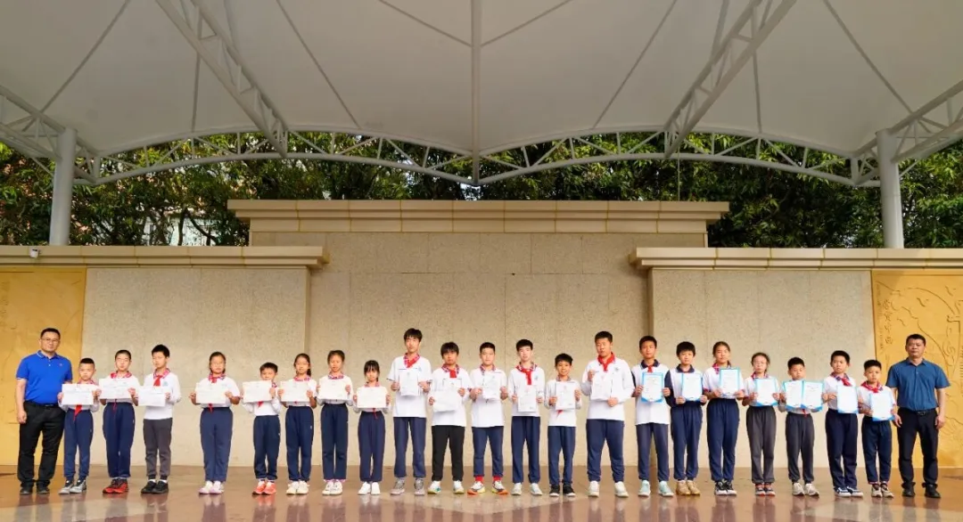 教师发展中心杨波主任宣读近期师生校外获奖情况,方建军校长、黄哲昙副校长、黄秋敏副校长及朱中振校长助理为获奖师生颁奖。一份份荣誉见证着师生的不懈努力,也为校园再添荣光。